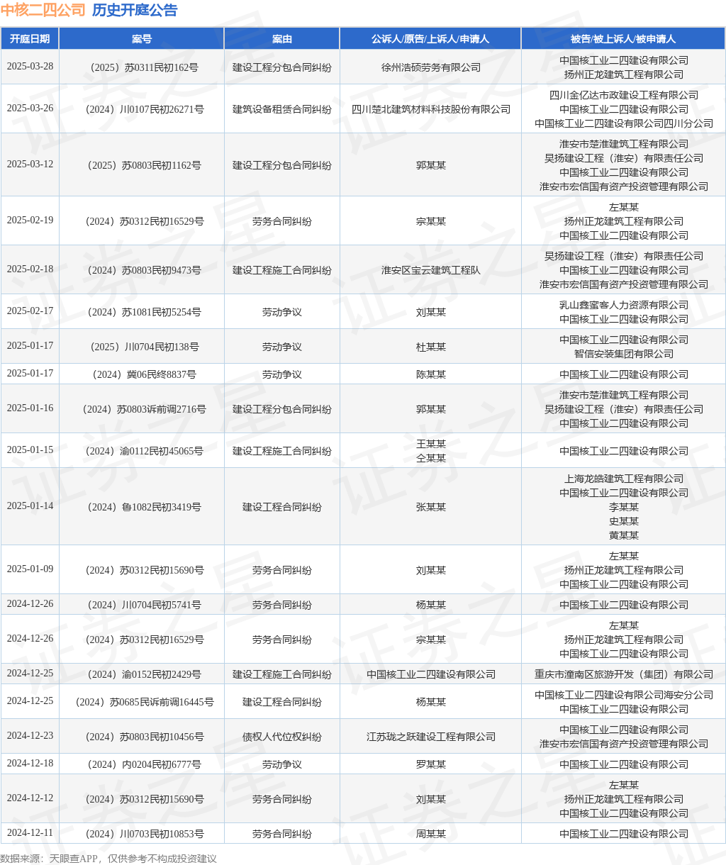 本站消息,根据天眼查APP显示,近日公布了一则中国核工业二四建设有限公司作为被告/被上诉人的开庭公告,详细内容如下: